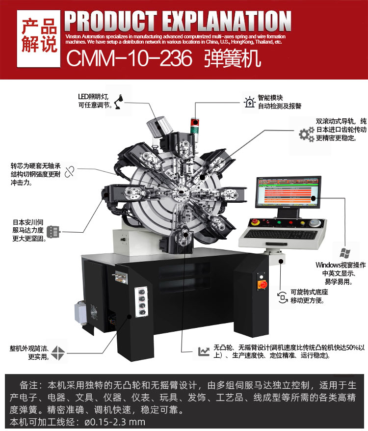 • 產(chǎn)品概述: CMM-10-236電腦彈簧機 可生產(chǎn)?0.15-2.3 mm線徑彈簧及線成形等)本機采用獨特的無凸輪和無搖臂設(shè)計,由多組伺服馬達獨立控制,可以生產(chǎn)各種各樣異型彈簧、壓簧、雙扭簧、電池簧、扁簧(發(fā)條簧)及各種線成型等。精密準(zhǔn)確、調(diào)機快速、穩(wěn)定可靠。