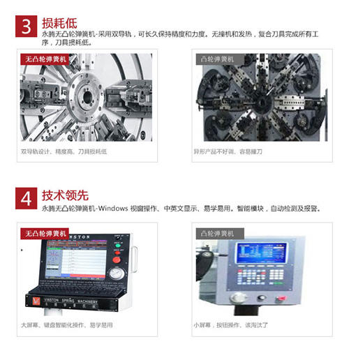 在近幾年無凸輪彈簧機逐漸得到彈簧生產(chǎn)廠家的認可。與傳統(tǒng)帶凸輪彈簧機相比,永騰無凸輪彈簧機在設(shè)計上采用獨特的無凸輪和無搖臂設(shè)計(調(diào)機速度比傳統(tǒng)凸輪機快達50%以上),其中無撞機和發(fā)熱、復(fù)合刀具完成所有工序,刀具損