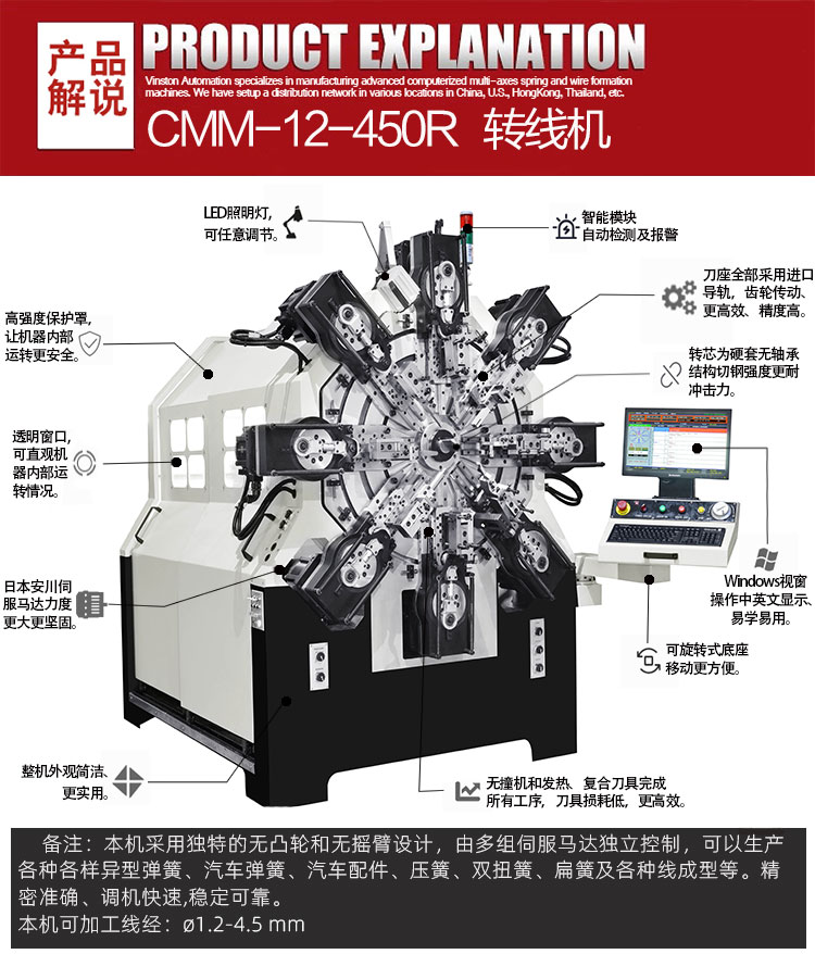 • 產(chǎn)品概述: CMM-12-450R 轉(zhuǎn)線彈簧機(jī)可生產(chǎn)?1.2-4.5 mm線徑彈簧及線成形等),本機(jī)采用獨(dú)特的無(wú)凸輪和無(wú)搖臂設(shè)計(jì),由多組伺服馬達(dá)獨(dú)立控制,可以生產(chǎn)各種各樣異型彈簧、汽車彈簧、汽車配件、壓簧、雙扭簧、扁簧及各種線成型等。精密準(zhǔn)確、調(diào)機(jī)快速、穩(wěn)定可靠。