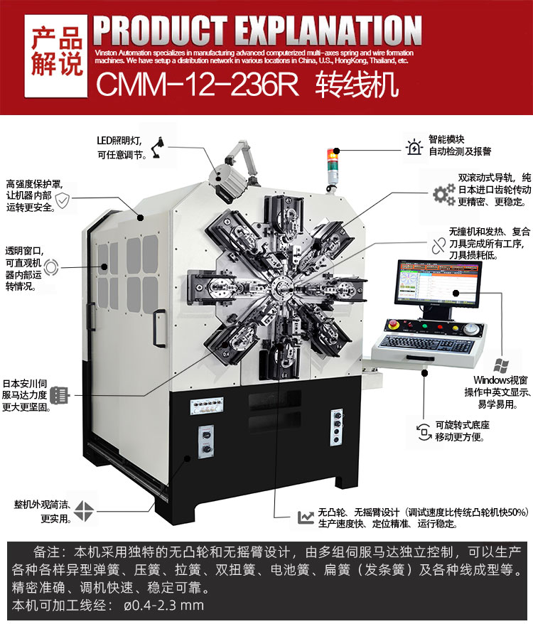 • 產(chǎn)品概述: CMM-12-236R 轉(zhuǎn)線(xiàn)彈簧機(jī).可生產(chǎn)?0.4-2.3 mm線(xiàn)徑彈簧及線(xiàn)成形等)本機(jī)采用獨(dú)特的無(wú)凸輪和無(wú)搖臂設(shè)計(jì),由多組伺服馬達(dá)獨(dú)立控制,可以生產(chǎn)各種各樣異型彈簧、壓簧、拉簧、雙扭簧、電池簧、扁簧(發(fā)條簧)及各種線(xiàn)成型等。精密準(zhǔn)確、調(diào)機(jī)快速、穩(wěn)定可靠。