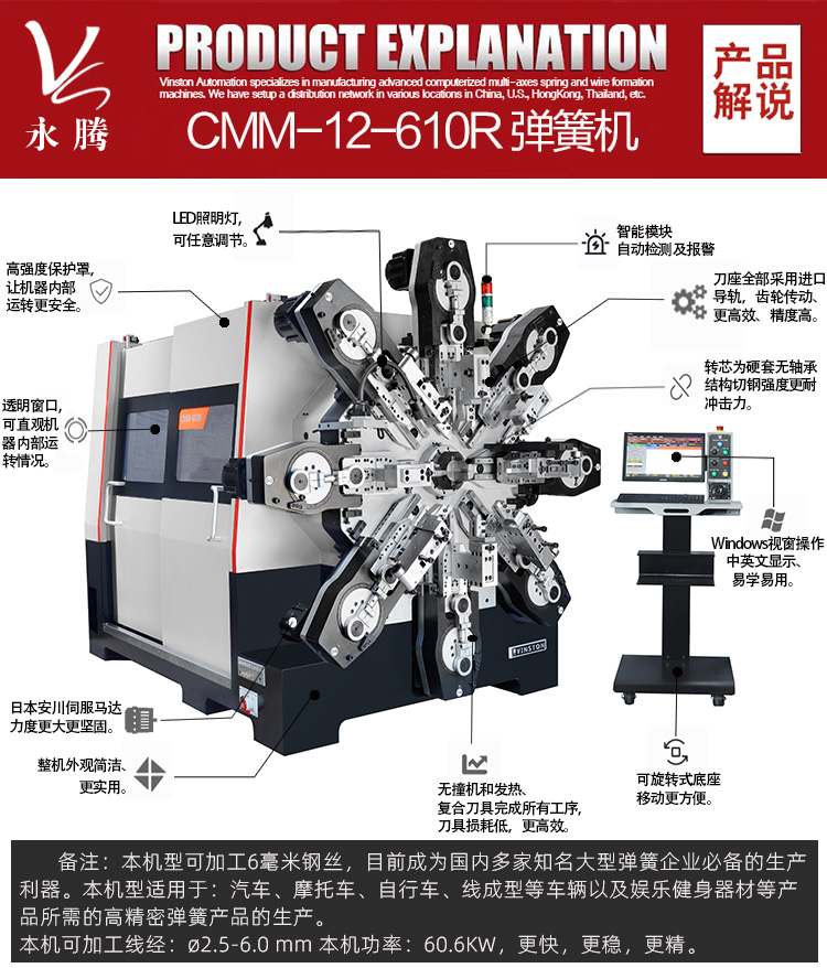 - 產(chǎn)品概述: CMM-12-610R 電腦彈簧機 可生產(chǎn)?2.5-6.0 mm線徑彈簧及線成形等)本機采用獨特的無凸輪和無搖臂設(shè)計,由多組伺服馬達獨立控制,可以生產(chǎn)各種各樣異型彈簧、壓簧、拉簧、雙扭簧、渦卷簧、扁簧(發(fā)條簧)汽車配件,汽車彈簧,家具五金,衛(wèi)浴線材成型及復(fù)雜線材成型等。精密準確、調(diào)機快速、穩(wěn)定可靠。