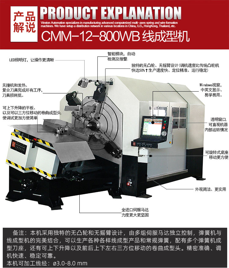 • 產(chǎn)品概述: CMM-12-800WB線材成型機(jī)可生產(chǎn)?3.0-8.0 mm線經(jīng)線成型)本機(jī)采用獨(dú)特的無(wú)凸輪和無(wú)搖臂設(shè)計(jì),由多組伺服馬達(dá)獨(dú)立控制,彈簧機(jī)與線成型機(jī)的完美結(jié)合,可以生產(chǎn)各種各樣線成型產(chǎn)品和常規(guī)彈簧,配有多個(gè)彈簧機(jī)成型刀座,還有可上下升降以及前后上下左右三方位移動(dòng)的卷曲成型頭。精密準(zhǔn)確、調(diào)機(jī)快速、穩(wěn)定可靠。