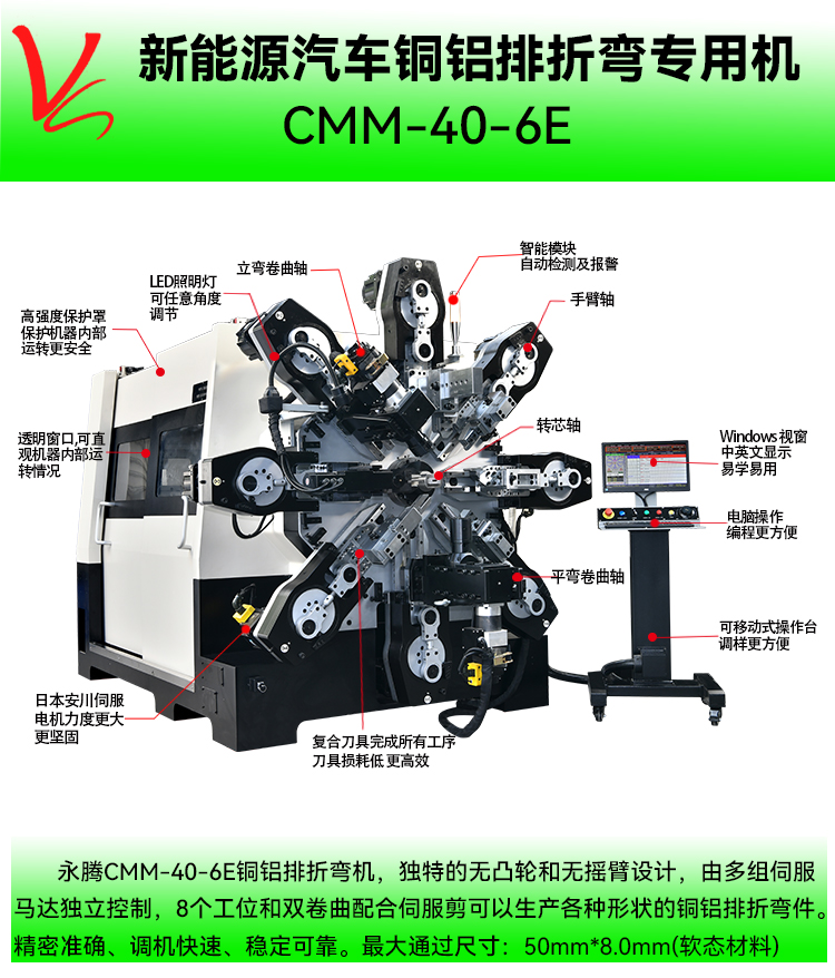 • 產(chǎn)品概述: CMM-40-6E銅排折彎機(最大通過尺寸:50mm*8.0mm)集3D折彎機和彈簧機所有的功能于一體的多功能專用機,本機采用獨特的無凸輪和無搖臂設(shè)計,由多組伺服馬達獨立控制,永騰銅排折彎機廣泛應(yīng)用于導(dǎo)電排成型,新能源電池連接排、新能源電池模組、銅母排成型、硬排成型、導(dǎo)電排、電池連接排、銅排、裸排成型等。精密準確、調(diào)機快速、穩(wěn)定可靠。