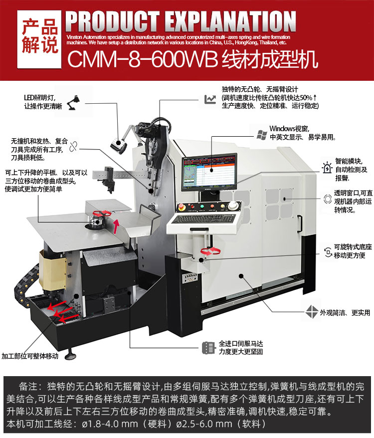 特別說明:本機重點為衛(wèi)廚五金行業(yè)量身打造。除此外,還適用于汽車、摩托車、自行車等及娛樂健身器材所需的高精密彈簧及線成型的生產(chǎn)。
