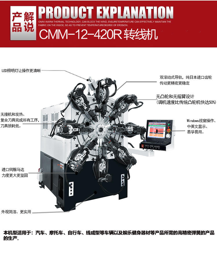 獨特的無凸輪和無搖臂設計,由多組伺服馬達獨立控制,可以生產各種各樣異型彈簧、壓簧、雙扭簧、電池簧、扁簧(發(fā)條簧)及各種線成型等。精密準確、調機快速、穩(wěn)定可靠。