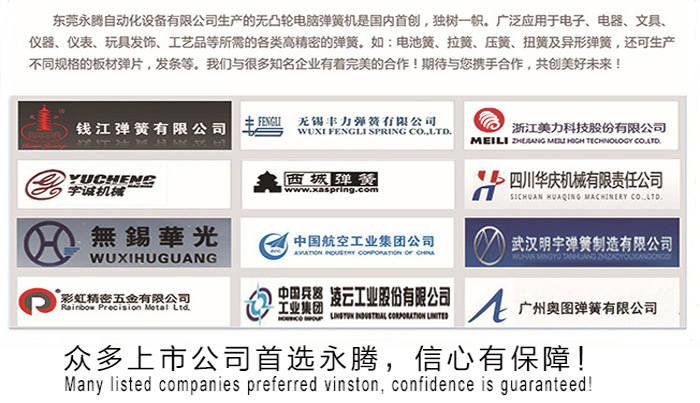 東莞永騰自動化設(shè)備有限公司是一家專業(yè)生產(chǎn)CNC多軸多功能無凸輪電腦彈簧機(jī)、線材成型機(jī)的美國獨(dú)資企業(yè)。本公司從2001年開始運(yùn)用美國先進(jìn)的伺服控制技術(shù)進(jìn)行一次具有重要意義的技術(shù)改革,打破傳統(tǒng)的凸輪帶動成型模式,成為行業(yè)創(chuàng)新的無凸輪模式兼?zhèn)錂C(jī)械手的彈簧機(jī)??杉庸ぞ€徑0.15-12mm范圍彈簧及線材成型。