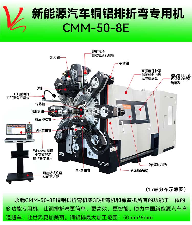• 產(chǎn)品概述: CMM-50-8E銅排折彎?rùn)C(jī)(最大通過(guò)尺寸:50mm*8.0mm)集3D折彎?rùn)C(jī)和彈簧機(jī)所有的功能于一體的多功能專用機(jī),本機(jī)采用獨(dú)特的無(wú)凸輪和無(wú)搖臂設(shè)計(jì),由多組伺服馬達(dá)獨(dú)立控制,永騰銅排折彎?rùn)C(jī)廣泛應(yīng)用于導(dǎo)電排成型,新能源電池連接排、新能源電池模組、銅母排成型、硬排成型、導(dǎo)電排、電池連接排、銅排、裸排成型等。精密準(zhǔn)確、調(diào)機(jī)快速、穩(wěn)定可靠。